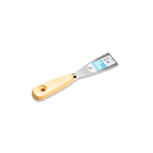 Espátula básica para bricolaje de 40 mm fabricada con hoja de acero al carbono flexible y mango de madera con agujero colgador. Diseñada para que la hoja se adapte a las irregularidades de la pared, "arrastrando" el material para dejar un acabado fino y sin surcos.