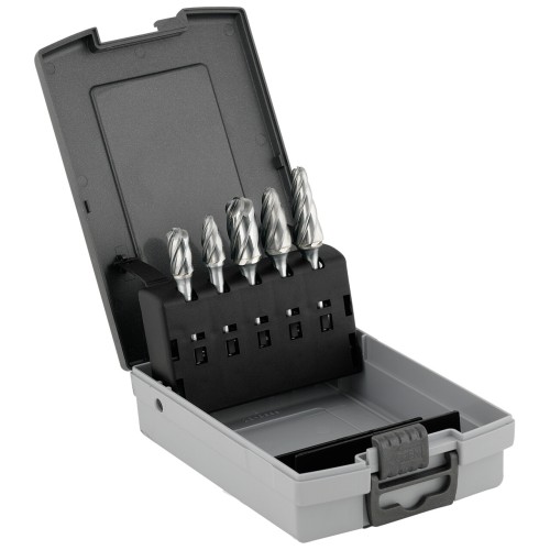 El juego de fresas de metal duro Premium para el rectificado penetrante recto se fabrica en rectificadoras CNC de última generación. De este modo se obtienen herramientas de precisión de gran eficacia en distintas versiones que cumplen todos los requisitos para obtener resultados óptimos. La agresiva forma de la fresa es especialmente viruta larga y permite arrancar el máximo de virutas cuando se trabaja en zonas de difícil acceso. Gracias a la geometría especialmente desarrollada de los filos, esta herramienta consigue mantener siempre baja la formación de calor para proteger la pieza de trabajo y la fresa. El juego contiene las cinco formas de fresa más usuales, lo que le permite conseguir la mejor duración de la fresa y la mayor vida útil para casi todas las duraciones operarias en una amplia gama de materiales.