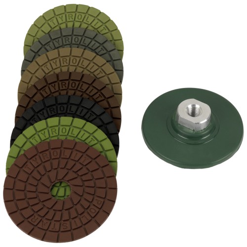 - El set POLISTAR incluye 7 platos de pulidos diferentes en tamaños de grano 50, 150, 300, 500, 1000, 2000, 3000 así como un plato soporte con tuerca M14.