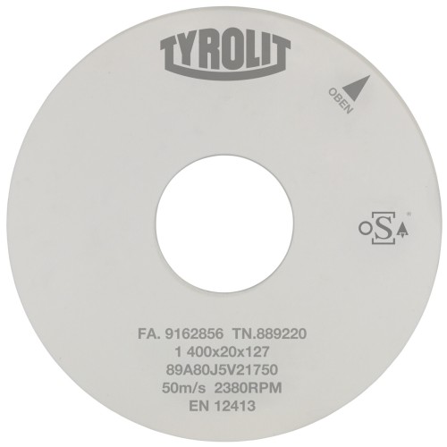 Variante: 1 400x25x127 89A80J5AV217 50 Form: 1 MUELA RECTA Diámetro: 400 mm Taladro: 127 mm Espesor: 25 mm Grano: 80 Especificación: 89A 802 J5A V217 /50 Vs /max: 50 m/s Idoneidad del material: Acero Herramienta para: Herramientas de rectificado cilíndrico de exteriores Dimensión D x T x H: 400 x 25 x 127 mm Revoluciones por minuto, máx.: 2.4 rpm / U/min Abrasivo: A Tipo de aglomerante: V