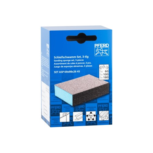 Las esponjas abrasivas son adecuadas para el desbaste manual de superficies planas e irregulares. Son ideales para el mecanizado de madera, pinturas y metales, para la construcción en seco y para todo tipo de piezas de trabajo pequeñas. El juego de tres piezas permite el uso de lijado fino o basto.