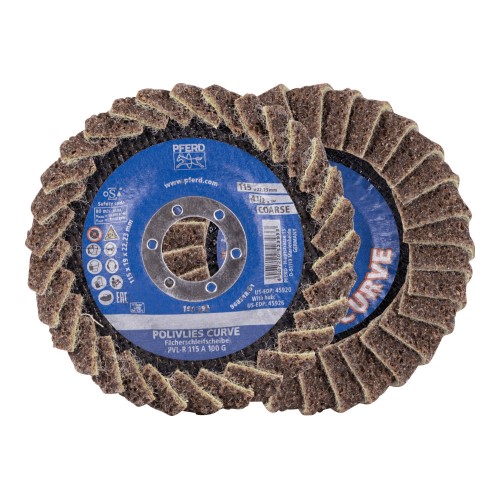 Para todo tipo de aplicaciones, desde lijado basto hasta lijado fino tanto en la industria como en el taller. La ejecución Curve puede utilizarse tanto en el lado abrasivo como en la parte trasera, así como en el radio. El disco de láminas lijadoras POLIVLIES PVL-R se ha desarrollado especialmente para el mecanizado de cordones en ángulo. Es el único disco de láminas lijadoras de todo el mundo que tiene láminas tanto en el lado abrasivo como en la parte trasera, así como en el radio. El disco de láminas lijadoras POLIVLIES PVL-R de PFERD TOOLS está patentado en muchos países del mundo. Tamaño de grano POLIVLIES 100 G = basto (marrón claro)