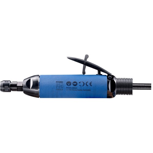 La máquina está equipada con una fijación de pinzas para herramientas de mango. La salida de aire de la máquina neumática se encuentra detrás. Amoladora recta neumática que cumple las normas técnicas más exigentes con salida de aire trasera y conmutación de hombre muerto mediante válvula de palanca de seguridad. La máquina neumática solo puede utilizarse con aceite. La máquina dispone de una conmutación de hombre muerto gracias a la válvula de palanca. Manguera de salida de aire de 1 m y manguera de alimentación de aire de 3 m con rosca de 1/4" exterior y boquilla de enchufe con rosca (STGI), pinza de 6 mm (grupo de pinzas 20) y 2 llaves de fijación (1x EM SW 9/16“, 1x EM SW 3/4“).