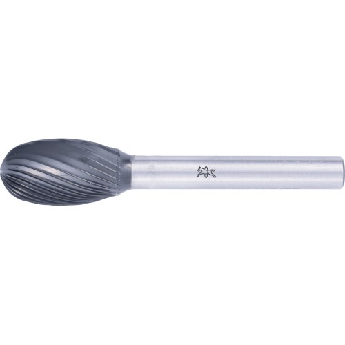El dentado 3 con el recubrimiento de alta calidad HICOAT HC-FEP es especialmente adecuado para el mecanizado con arranque de virutas de hierro fundido, acero, acero inoxidable (INOX), así como aleaciones con base de níquel y titanio. Se caracteriza por una buena capacidad de arranque de material. Además, facilita una mayor vida útil para las herramientas y permite su uso en el nivel de revoluciones de corte más alto en comparación con las fresas sin recubrimiento. Fresa forma de gota según DIN 8032 con dentado según DIN 8033.