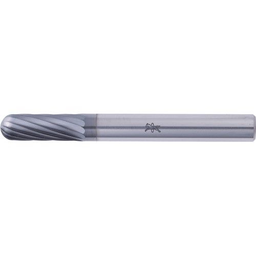 El dentado 3 con el recubrimiento de alta calidad HICOAT HC-FEP es especialmente adecuado para el mecanizado con arranque de virutas de hierro fundido, acero, acero inoxidable (INOX), así como aleaciones con base de níquel y titanio. Se caracteriza por una buena capacidad de arranque de material. Además, facilita una mayor vida útil para las herramientas y permite su uso en el nivel de revoluciones de corte más alto en comparación con las fresas sin recubrimiento. Fresa de forma cilíndrica redonda según DIN 8032 con dentado según DIN 8033. Combina las geometrías cilíndrica y esférica.