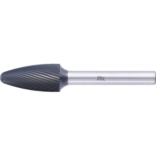 El dentado 5 con el recubrimiento de alta calidad HICOAT HC-FEP es especialmente adecuado para el mecanizado fino con arranque de virutas de hierro fundido, acero, acero inoxidable (INOX) y materiales refractarios, como las aleaciones con base de níquel y cobalto. Genera buenas superficies, facilita una mayor vida útil para las herramientas y permite su uso en el nivel de revoluciones de corte más alto en comparación con las fresas sin recubrimiento. Fresa forma de gota según DIN 8032 con dentado según DIN 8033.